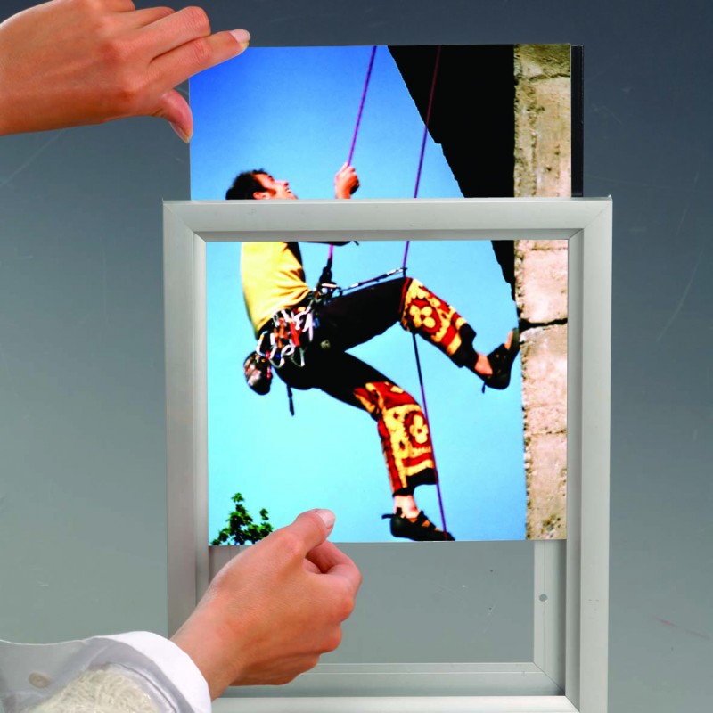 Rama cu încărcare laterală, simplă față, este produsă din profil de aluminiu de foarte bună calitate, are colțurile tăiate la 45° și o singură închidere laterală din plastic. Schimbarea posterului se face cu foarte mare ușurință, prin glisare. Poate fi folosită pentru expunere portrait sau landscape. Produsul se livrează împreună cu folia antireflex de 0.4mm și setul de fixare.