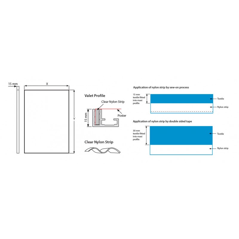 Profilul Valet este realizat din aluminiu argintiu și este utilizat pentru rame cu personalizarea printului pe material textil.